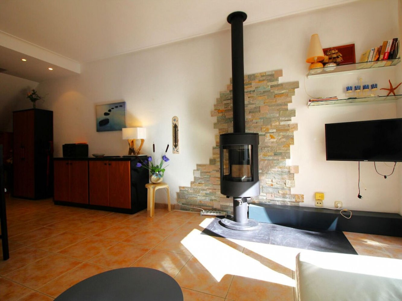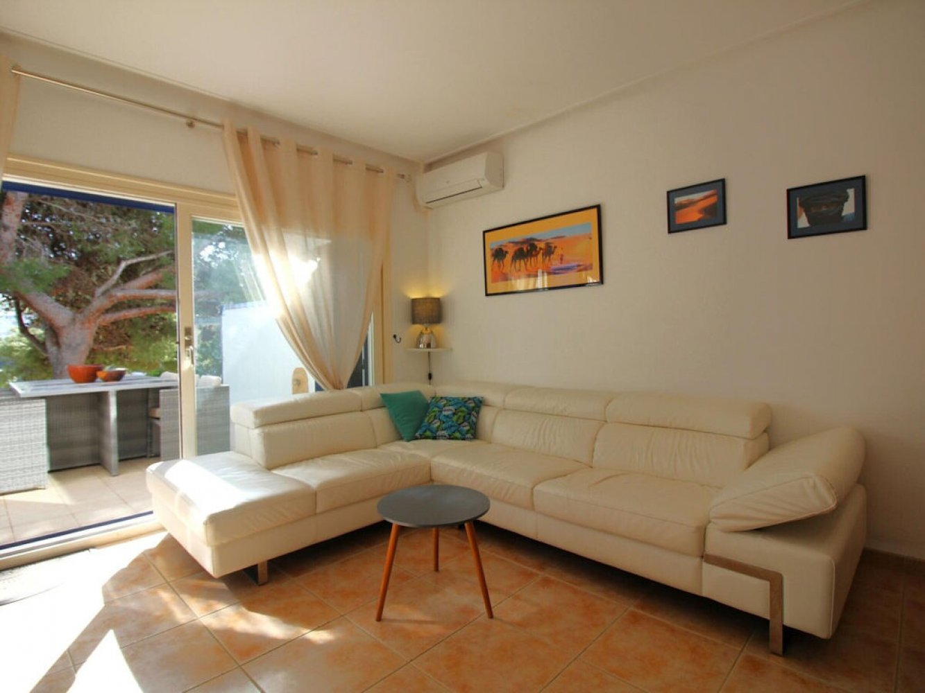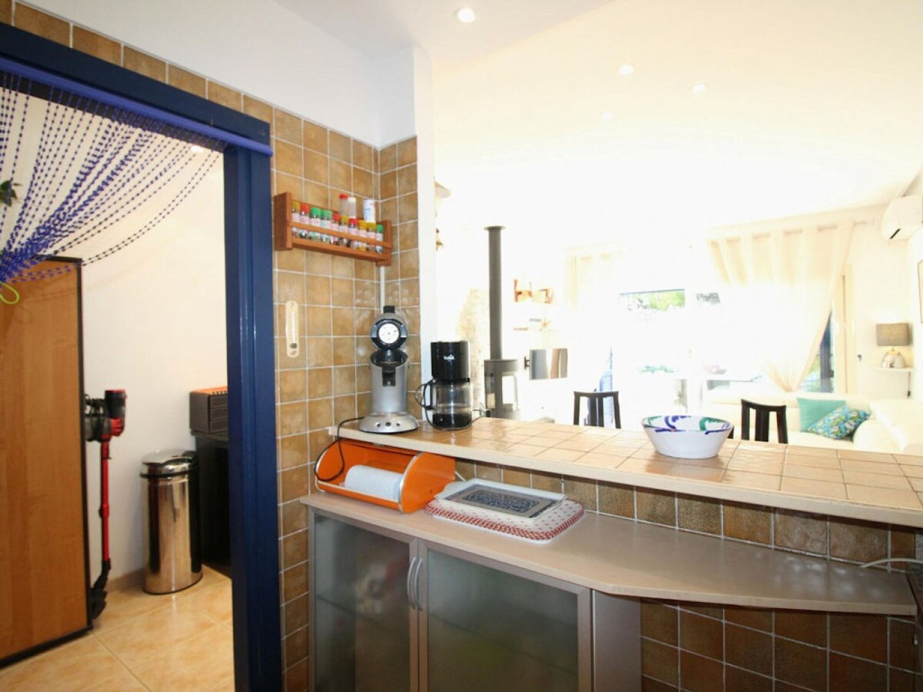 The villa is spread over two floors. On the ground floor, you will find a bright and airy living and dining area with a fireplace and TV, as well as a modern, fully equipped kitchen with dishwasher, washing machine, and dryer. There is also a double bedroom and a modern bathroom. From this area, you can step out onto the large terrace, offering fantastic sea views and direct access to the beach. Upstairs, there are two double bedrooms and another modern bathroom.